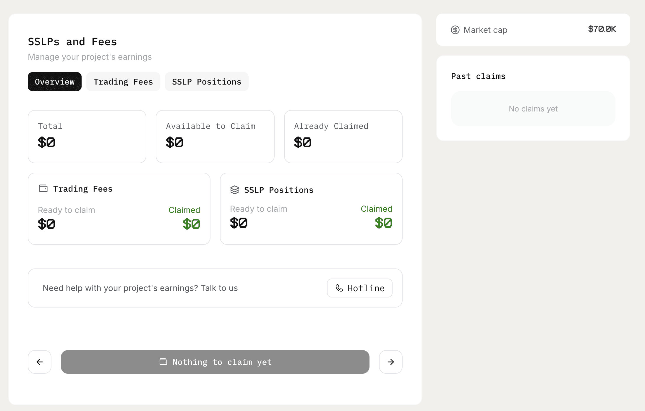 post-launch, your earnings accrue from two sources: trading fees and SSLP positions. you claim them from the "SSLPs and fees" section in your project dashboard.